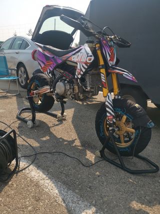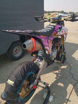 - 212cc, culata Daytona 4 válvulas preparada, eje de arranque totalmente anulado con su tapón, dando 28cv, hecho solo el rodaje. - Carburador Voca 28, con embudo Polini. - Rotor Malossi Selettra. - Cable bujía Ngk Racing. - Horquillas preparadas con aceite Ohlins y muelles para 75kg, se dan otros muelles para 85kg. - Escape Lm R8. - Freno delantero Fórmula con disco Galfer 220mm. - Estriberas retrasadas regulables. - Neumáticos Pmt soft prácticamente nuevos. - Cadena Regina nueva. - Latiguillos Rodicard. - Regalo otro kit de plásticos. Sólo la preparación y los extras valen más. No negociable