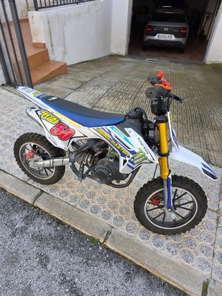 Mini moto de cross Rebel Master 50cc con un diseño deportivo y llamativo. - Diseño en colores azul y blanco. - Estilo de moto de cross. Moto con dos salidas. ( literal ) Se ha quedado pequeña y por eso es el motivo de la venta.
