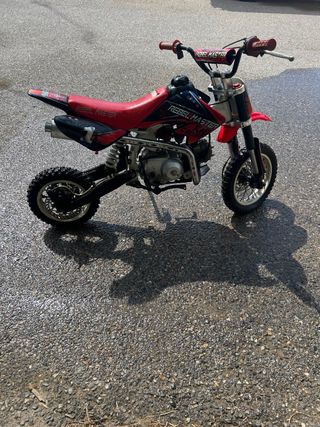 Pitbike de la marca Rebel Master, modelo de motocross. - Color principal rojo con detalles en negro. - Ruedas todoterreno.