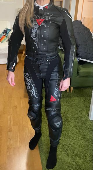 Traje / Mono Dainese YU LADY N (para moto de carretera) Mono divisible Dainese Yu Lady. NUEVO. Confeccionado en piel D-Skin. Incorpora protecciones compuestas en hombros, codos y rodillas. Forro interior Sanitized fijo. Zonas con tejido elástico. Áreas con protecciones blandas. Sliders intercambiables. Tipología: 2 piezas Riding Style: sport / racing Género : Mujer Color : negro Talla : 40 (equivalente a T. 36) tambien tengo botas a conjunto del 39