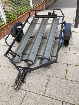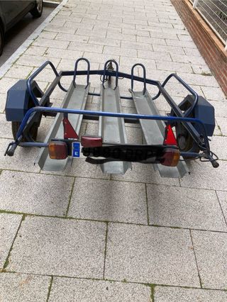 Se vende remolque con documentación de la marca Erde para transportar hasta tres motos. (SE ENCUENTRA EN UNA POBLACION DE MADRID) Super estable en carretera o autovia (no va dando botes ni zarandeos de un lado a otro incluso con solo una moto de trial) El eje / barra de suspensión que lleva le da la rigidez, estabilidad, confort y comodidad de conducción inigualable frente a cualquier otro fabricante. Se puede acortar o alagar sacando o metiendo la puerta abatible portamatricula/luces. Se pueden desplazar tanto derecha/izquierda como adelante/atras las plataformas portamotos. Tiene candado/cerradura seguridad en mecanismo enganche