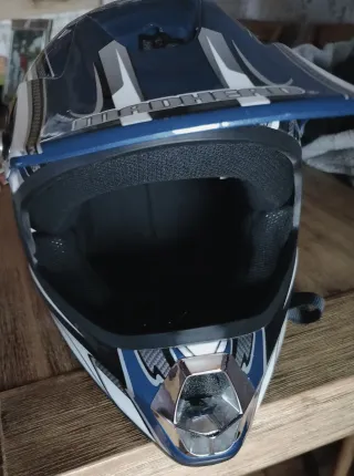 Casco de moto con un diseño moderno y deportivo. - Color principal azul con detalles en blanco y plateado. - Visera integrada. - Acolchado interior.