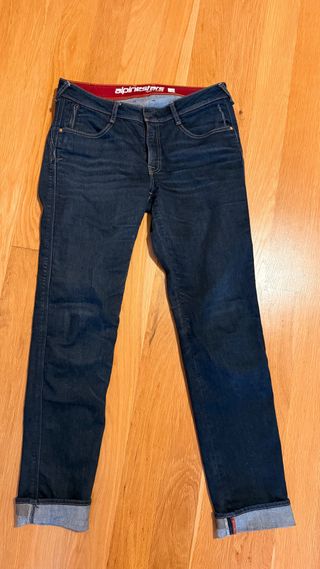 Pantalón vaquero de moto para mujer de la marca Alpinestars. Talla 34. - Tejido vaquero resistente. - Cintura con logo de la marca. - Protecciones de rodilla flex
