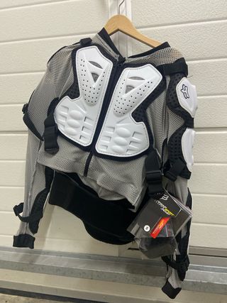 Chaqueta de protección integral para moto, ideal para enduro y motocross. - Diseño con paneles protectores en blanco y malla gris. - Cierre frontal con cremallera. - Cinturón ajustable para mayor sujeción. - Incluye etiquetas originales.