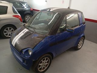 Microcoche de dos plazas con un diseño deportivo y llamativo. - Carrocería en color azul con detalles en negro. - Franjas blancas decorativas en el capó. - Llantas de aleación.