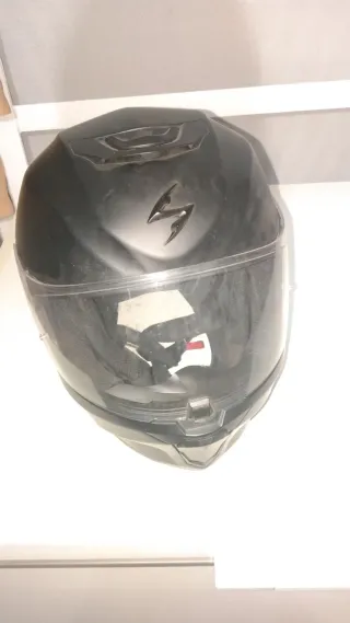 Casco de moto marca Scorpion. - Color negro mate. - Visera transparente. - Diseño deportivo.