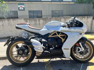 Preciosa MV Agusta Superveloce S en color blanco con detalles dorados. Una moto deportiva con un diseño clásico y elegante. Año: 22 Km: 6000 - Asiento de cuero marrón. - Llantas doradas de radios. - Carenado deportivo.