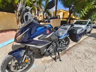 Honda NT 1100 manual en color azul (Julio 2025) modelo 2025, con tan solo 1000 kms y revisión rodaje realizada. - Maletas con capacidad para un casco integral: izquierda, de 37 litros; derecha, de 36 litros + ASIENTO COFORT HONDA - Carenado fabricado en material biodegradable y diseñado para una completa protección al viento, para lo cual dispone también de deflectores superiores e inferiores. - Pantalla parabrisas con regulación manual con una sola mano, cinco posiciones de ajuste y 167 mm de diferencia entre la posición más alta y la más baja. Asiento confort + original Puños calefactables y caballete central - Pegatinas HONDA