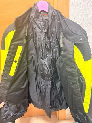Chaqueta de motorista para hombre, talla L, con poco uso. Combina colores negro y amarillo brillante para mayor visibilidad. - Cierre frontal con cremallera. - Múltiples bolsillos. - Cuello alto con cierre de botón. - Ajustes en puños y cintura. -Tiene forro de invierno y se quita en verano.