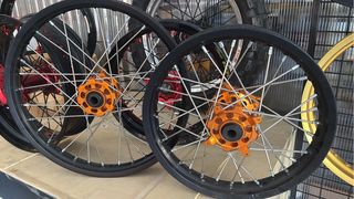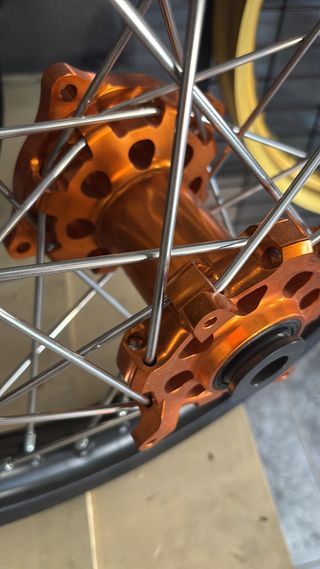 Conjunto de llantas para motos KTM, listas para la acción. - Diseño deportivo en negro y naranja. - Ideales para enduro, motocross.
