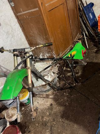 Se vende chasis de Rieju RR, ideal para proyectos de enduro. - Color principal dorado con detalles en verde. - Estilo de moto enduro.
