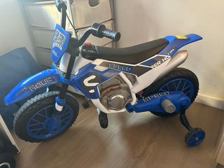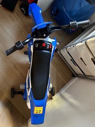 Moto de batería para niños en color azul y blanco. Ideal para que los más pequeños disfruten. - Diseño deportivo. - Ruedines de apoyo. - Volante con controles.