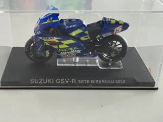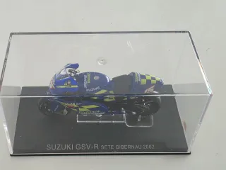Miniatura Suzuki GSV-R de Sete Gibernau (temporada 2002 – Telefónica Movistar Suzuki). Modelo de colección en escala 1:24. Incluye base original con placa y cúpula protectora transparente. Muy buen estado general, con leves marcas normales por el paso del tiempo (ver fotos). Fabricado en China. Ideal para coleccionistas de MotoGP y fans de Sete Gibernau. Difícil de encontrar en esta decoración y escala. Se envía muy bien protegido. Wallapop Envíos OK.