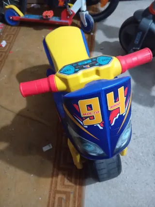 Moto de juguete para los más pequeños, con un diseño llamativo y divertido. - Asiento amarillo. - Puños rojos. - Detalles en azul y amarillo.