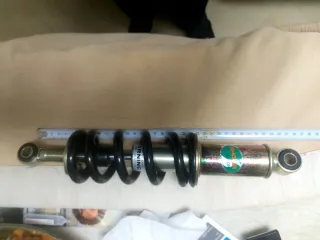 Amortiguador trasero de la marca Showa, ideal para motocicletas o vehículos similares. Cuenta con un muelle helicoidal negro y cuerpo metálico. - Marca: Showa - Color del muelle: Negro - Material: Metal