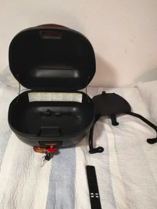 Baúl de gran capacidad para moto tipo maxi scooter. Su diseño es elegante y funcional. Con respaldo para la persona de atras, totalmente nuevo. - Color negro. - Acabado mate.