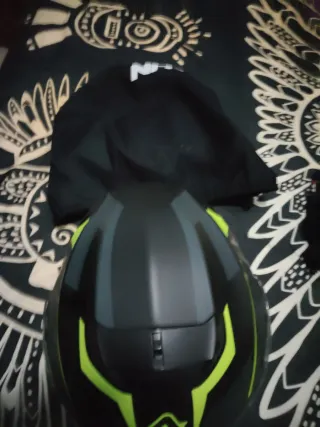 Casco de moto negro y verde con funda