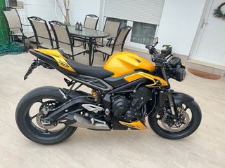 Se entrega con la transferencia hecha. Triumph Street Triple 765 RS de Febrero de 2025. Tiene 3.200 kms y la primera revisión sellada en concesionario oficial. Tiene su correspondiente garantía de la marca hasta 2028. Lleva varios extras como portamatriculas Lightech, protectores de motor y protector de radiador. Es prácticamente un reestreno, se mire por donde se mire. Podría valorar algún tipo de cambio. Tags: Honda, Suzuki, Yamaha, Kawasaki, Ducati, Streetfighter, v2, Mt09, Mt, naked, cbr, gsxr, Panigale, Zx6r, Zx10r, etc...