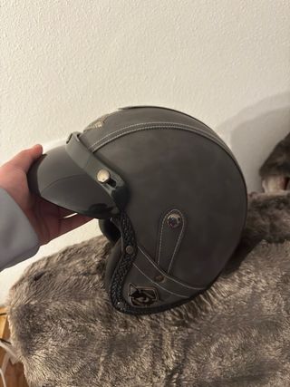 Casco de moto abierto con un diseño moderno y cómodo. -Talla L y S - Acabado en imitación piel. - Costuras decorativas. - Visera integrada. - Detalle trenzado en los laterales. 50€ por los dos 30€ por separado