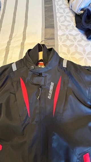 Chaqueta de moto RAINERS MISURI talla M Color negro con rojo, franjas reflectantes. - Protecciones en hombros y codos. - Forro térmico desmontable con bolsillo. - Membrana impermeable. - Cinturón, codos y puños ajustables, cremallera para juntarla al pantalon. Usada poco en perfecto estado.