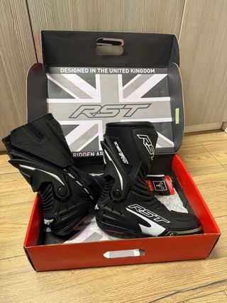 Botas de moto RST en color negro. Nuevas usadas 1 vez!! Las vendo porque tengo en venta la moto! - Cierre con hebillas y velcro. - Protecciones en tobillo y espinilla. - Suela antideslizante. - Detalle de logo RST en blanco. - Talla 44