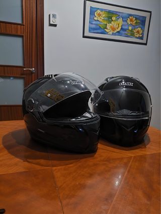 Pack 2 cascos integrales UNIK. Tallas S (55–56 cm) y L (59–60 cm). Homologados ECE 22.05. Presentan marcas de uso visibles (ver fotos). Ideales como cascos urbanos o acompañante.