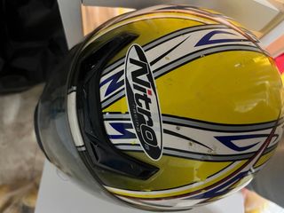 Casco de moto con un diseño llamativo en amarillo y blanco. - Marca Nitro. - Diseño con líneas dinámicas.