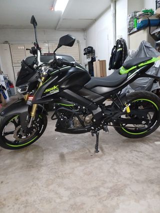 Moto QJ Motor SRK 125 Naked en color negro con detalles en verde. Se vende QJ Motor SRK 125 de abril de 2025 por cambio de cilindrada. Única propietaria. Moto con 15 CV apta para carnet B con 3000 Km. Revisiones al día en concesionario oficial. Luces e intermitentes led, con un gasto actual de 2'4 l/100km Dispone de protectores de motor completos. Pantalla multifunción con mirroring, presenta también presión de neumáticos. Dispone de toma USB en el manillar. Garantía hasta 2031, seguro en vigor hasta abril 2026. Cambio de nombre en gestoría a cargo del comprador Se regala pinza antirobo y juego completo de retrovisores - Naked