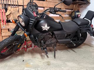Moto estilo custom en color negro. - Diseño clásico y elegante. - Asiento cómodo. - Detalles cromados. Batería nueva,duerme en garage,es de segunda mano,pero está sin usar por mi,foco delantero nuevo..revisada y puesta a punto por un mecánico de confianza..