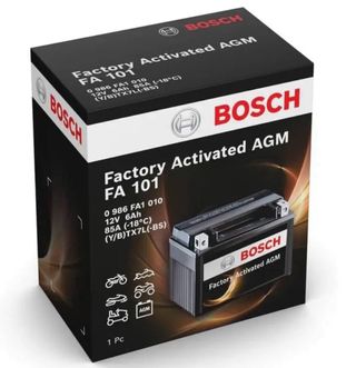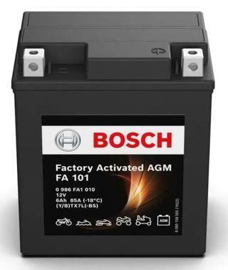 Batería Bosch FA101, activada de fábrica. NUEVA - Modelo: FA 101 - Voltaje: 12V - Capacidad: 6Ah - Corriente de arranque en frío (CCA): 85A (-18°C) - Código de referencia: 0 986 FA1 010 - Tipo de terminal: (Y/B)TX7L(-BS) - Tecnología: AGM