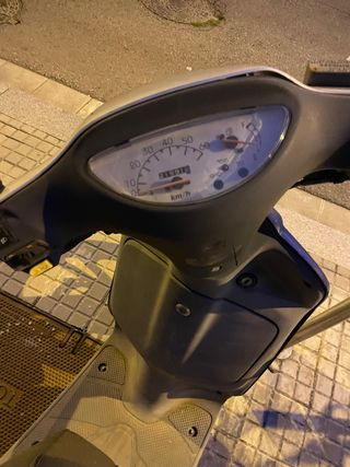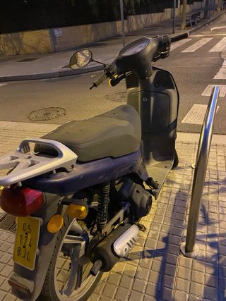Scooter Yamaha Why de 49cc, color azul claro. Modelo de 2012, motor de 2 tiempos. Solo 16000 km, y la ITV pasada hasta Diciembre 2027. Neumáticos nuevos de Octubre 2025. Muy ligera y fácil de conducir, con carnet de coche o de ciclomotor. Ideal para desplazamientos urbanos. Limitada a 45km/h pero el mecánico te puede sacar el limitador. Tiene etiqueta medioambiental B (aunque no lleva la pegatina al no ser obligatorio). Por 50€ más llévate también 1L de aceite y dos cascos, uno talla L y otro talla S.