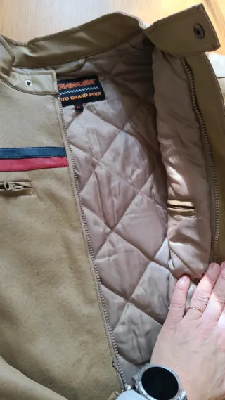Chaqueta de estilo motero con un diseño llamativo. - Color marrón - Detalles de rayas rojas y azules - Parche TEAM DYNASTAR MOTO GRAND PRIX en la manga - Cierre de cremallera y botones a presión en el cuello