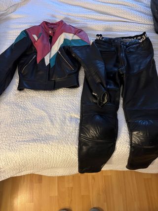Conjunto de chaqueta y pantalón de cuero para moto. En buen estado - Chaqueta con diseño de bloques de color. - Pantalón con protecciones en rodillas.