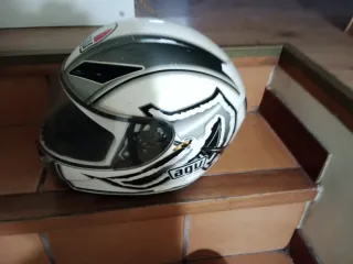 Casco de moto AGV con un diseño moderno y llamativo. - Diseño con detalles en blanco y gris. - Visera transparente.