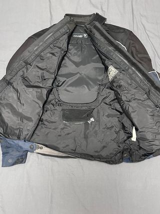 Chaqueta de moto con un diseño versátil para aventura y touring, de la marca Frank Thomas, modelo Aqua Force, J talla M - Combinación de colores negro y azul. - Múltiples bolsillos frontales con solapa y botón. - Cremalleras de ventilación en la parte frontal. - Cinturón ajustable en la cintura. - Detalles reflectantes en blanco y gris. - Incluye forro térmico interior desmontable y protecciones. Muy buen estado, perfecta para rutas largas y uso urbano.