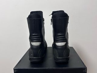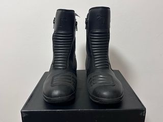 Botas de moto negras de caña alta marca Tournado, con certificación CE. Cierres laterales con cremallera y velcro, refuerzos en la zona gdel tobillo, espinilla y empeine. Suela antideslizante y zonas elásticas para mayor comodidad. Un uso, prácticamente nuevas. Perfectas para conducción en carretera, ciudad o rutas largas.