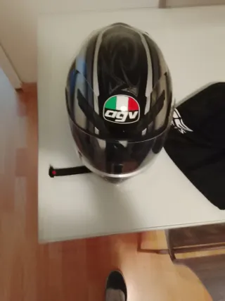 Casco de moto con un diseño llamativo en negro y detalles plateados. - Logo de AGV con la bandera italiana. - Visera oscura. - Incluye funda protectora negra.