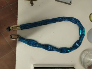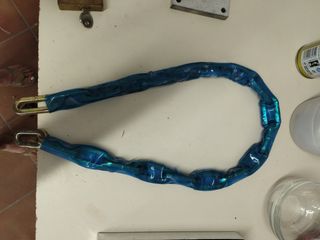 Cadena de seguridad para moto, en buen estado, 1 metro de largo. - Recubierta de plástico azul. - Incluye dos ganchos metálicos.