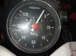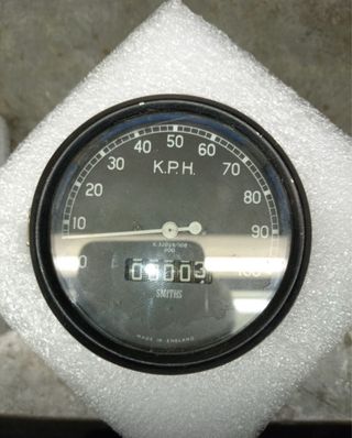 Cuenta kilómetros para moto inglesa, marca Deberny. Muestra la velocidad en Km/h. - Indicador de velocidad hasta 120 Km/h. - Odómetro con 6 dígitos. - 80 mm de diámetro