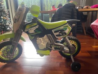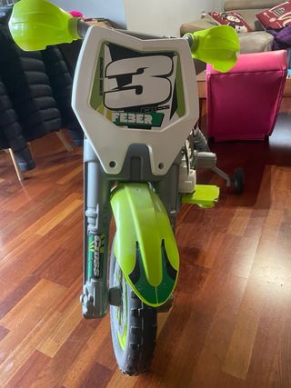 Moto eléctrica infantil de la marca Feber, modelo Rider Cross. - Diseño deportivo en colores verde y negro. - Ruedines traseros para mayor estabilidad.