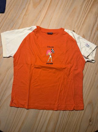 Camiseta de manga corta Dainese para mujer. - Diseño con mangas raglán en color blanco roto. - Parte delantera en color naranja con estampado. - Estampado de TEAM con una figura y bandera a cuadros.