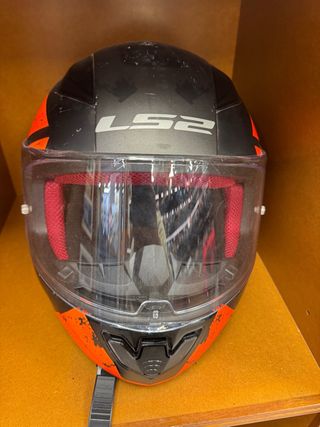 Casco de moto integral con diseño deportivo en negro y detalles naranjas. - Marca: LS2 - Color: Negro y naranja - Visera transparente - Interior rojo y negro Talla M