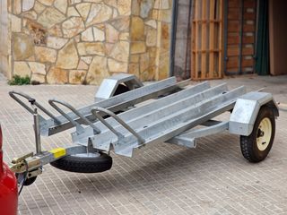 Remolque basculante. - Estructura robusta de acero galvanizado. - Rieles para sujeción de motos. - Rampa reforzada incluida. - Rueda de repuesto incluida.