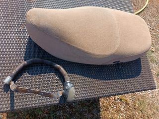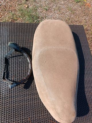 Asiento de moto de tela oscura. - Diseño ergonómico. - Banda de sujeción con pespuntes.