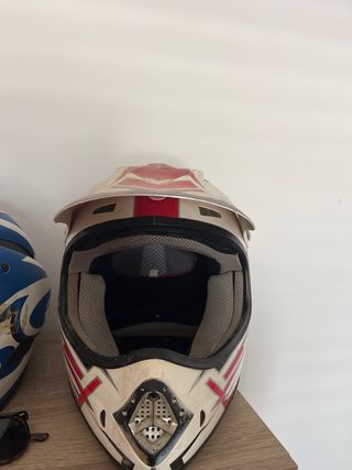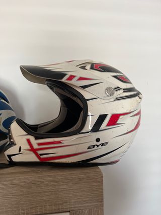 Casco de motocross con un diseño llamativo en blanco, negro y rojo. Ideal para la práctica de deportes de motor. - Diseño con gráficos de líneas rojas y negras. - Visera protectora. - Marca: BYE