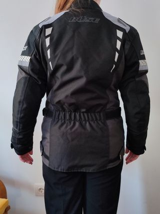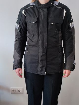 Chaqueta de moto para mujer de la marca Busse, en perfecto estado, usada muy pocas veces. Es negra y gris, con detalles reflectantes. Incorpora cortavientos extraíble con ventilación en axilas. Se une a la chaqueta con única cremallera y botones en las muñecas. - Talla: S - Marca: Blusse - Múltiples bolsillos - Ajuste en cintura, muñecas y cadera mediante velcro. - Cierre: Cremallera, botones a presión y velcro, con solapa. - Mallas de ventilación en loscostados con cierre por cremallera. -Protecciones en codos y hombros desmontables.