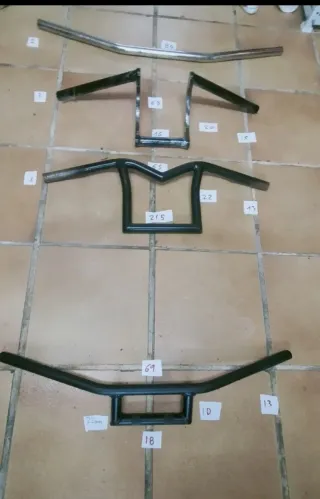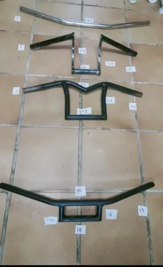 Lote de manillares de moto de diferentes estilos y acabados. - Manillar cromado. - Manillar negro con diseño. - Manillar negro con refuerzo central. En pulgadas y uno de 22