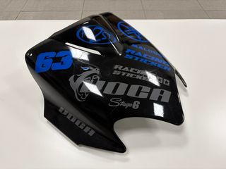 Carenado para Yamaha JOG RR con un diseño llamativo en negro y detalles en azul. - Diseño con número 63 y logo Voca. - Adhesivos de Malossi Racing Sticker y Stage 6.