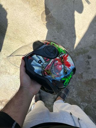 Casco de moto con un llamativo diseño de payaso. - Diseño con detalles en rojo y verde. - Visera transparente. en buena condiccion