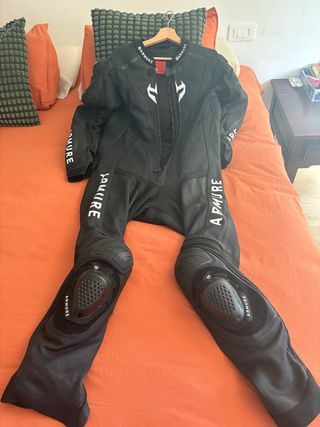 Mono de moto de la marca Armure, diseñado para un estilo deportivo. - Mono completo de cuero. - Protecciones integradas en rodillas y codos. - Cremallera frontal. - Logos de la marca visibles.